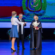 В этот праздничный вечер большая группа сотрудников из числа профессорско-преподавательского состава и обслуживающего персонала вуза была отмечена наградами городского, районного и ведомственного уровней. А имена доцента кафедры высшей математики кандидата физико-математических наук Олега Дубовика и действительного члена РАЕН, члена Российского и Европейского общества кардиологов, председателя Кардиологического общества г. Сургута и почётного профессора СурГУ Марины Поповой занесены в Книгу почёта Сургутского государственного университета. Высшей награды вуза – нагрудным знаком покровителей вуза святых равноапостольных Кирилла и Мефодия с внесением имени в Книгу почёта СурГУ удостоены гендиректор ООО «Стройзаказчик» Вячеслав Волков и завкафедрой спортивных дисциплин кандидат педагогических наук, доцент Сергей Обухов. Звание почётного доктора СурГУ присвоено губернатору Югры Наталье Комаровой.