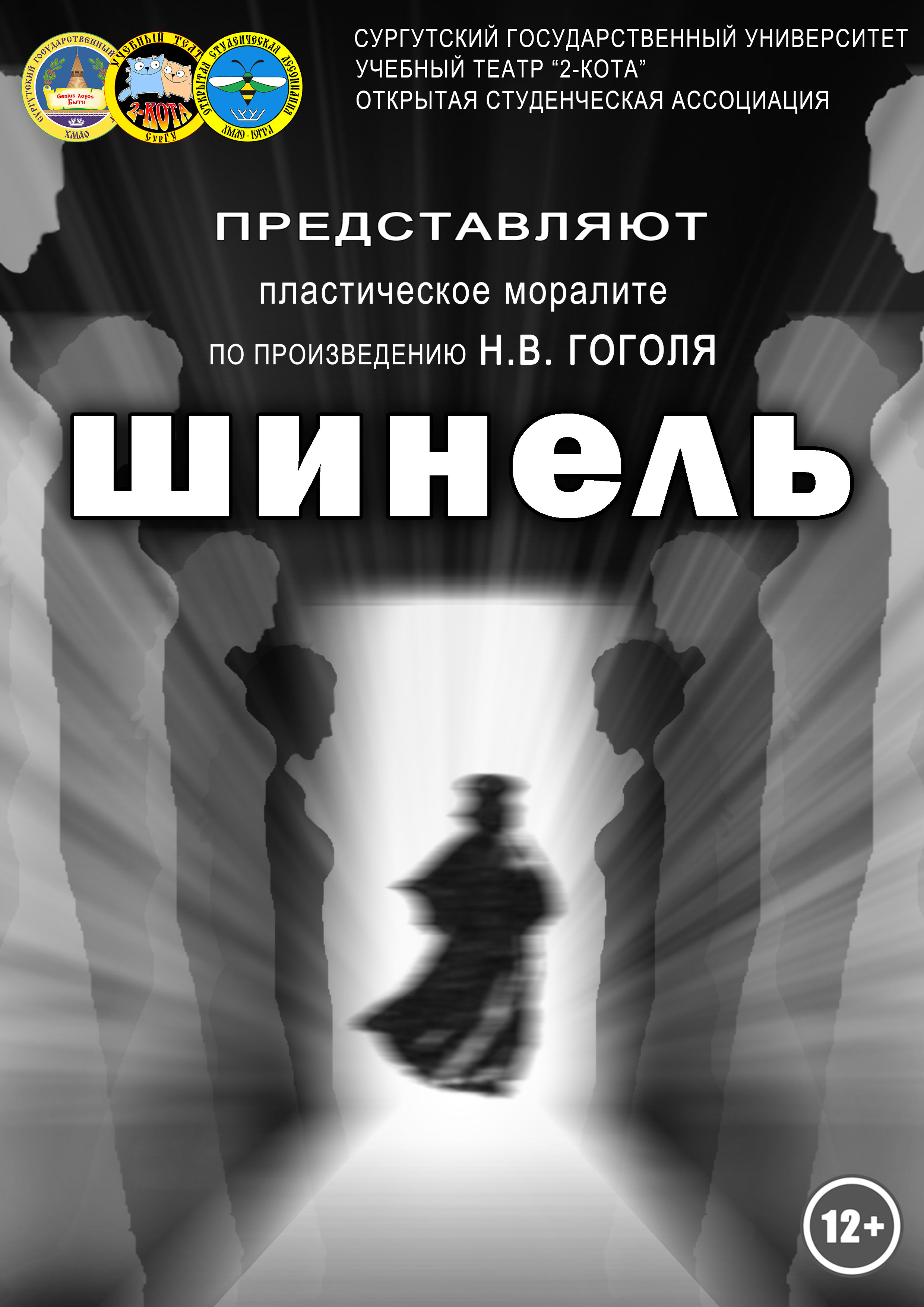 По итогам экспертной оценки жюри учебный театр «2 кота» Сургутского госуниверситета удостоен диплома первой степени в номинации «Лучший спектакль для юношества» и сертификата на 20 000 рублей за постановку пластического моралите по одноименной пьесе Николая Васильевича Гоголя «Шинель».