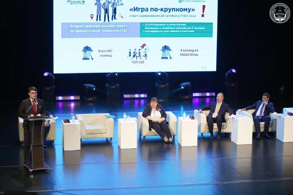 Открыл серию пленарных докладов выпускник Института гуманитарного образования и спорта СурГУ, а ныне – заместитель директора департамента образования и молодежной политики Ханты-Мансийского автономного округа – Югры Александр Гомзяк. Свой доклад Александр Богданович начал с цитаты древнеримского политического деятеля, оратора и философа Цицерона – «Умеренность – это уже богатство». Умение тратить меньше, чем получаешь – это одно из важнейших умений в современном мире. Югорский чиновник рассказал о развитии финансовой грамотности в образовательных организациях автономного округа, резюмировав: «Все окружные просветительские проекты, реализуемые совместно с партнерами, способствуют воспитанию грамотности потребителей финансовых услуг, обучают детей принимать разумные решения, способствуют развитию неравнодушного гражданина Югры, а значит в будущем помогут укрепить экономические позиции нашего региона и России в целом».