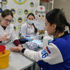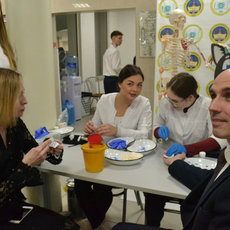 Высшее медицинское бинго знакомило с Медицинским институтом, куда ребята, ориентированные на специальности «Лечебное дело», «Педиатрия» и врачебное будущее, сразу направились, чтобы поработать за симуляторами и пообщаться с преподавателями. Они узнали, что такое прием Геймлиха, измерили оксигенацию крови и частоты пульса, научились грамотно проводить сердечно-легочную реанимацию и интубацию дыхательных путей и сфотографировались в белом халате на удачу.