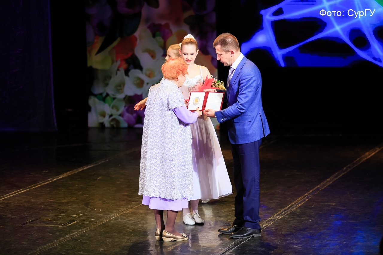 Особые слова благодарности прозвучали в этот вечер в адрес Людмилы Александровны Назиной. В знак признательности за заслуги перед университетом Иван Даниленко вручил ей высшую награду СурГУ — нагрудный знак покровителей университета святых Кирилла и Мефодия.