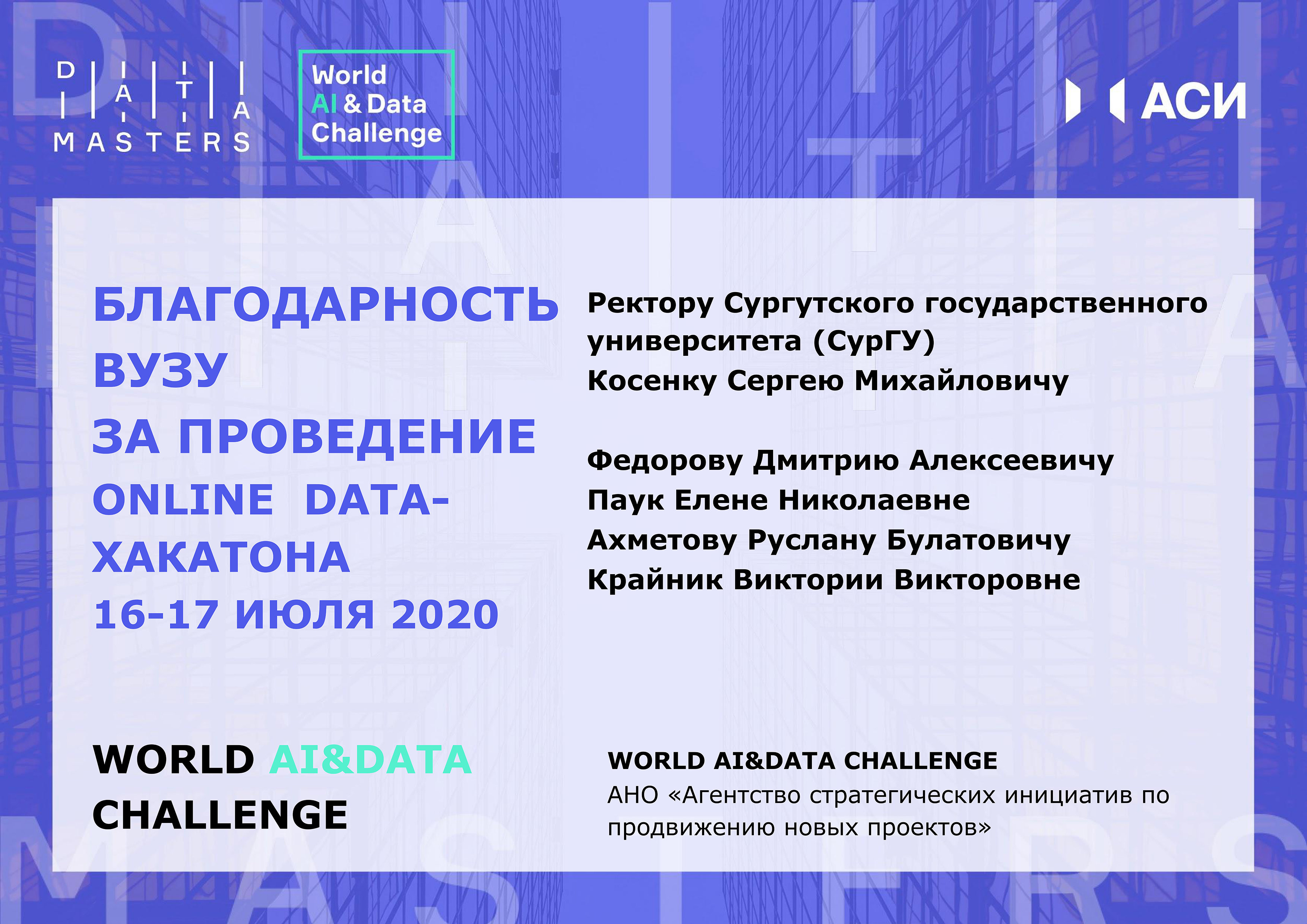 В четверг, 16 июля, при поддержке Сургутского государственного университета на онлайн-площадке «Точки кипения» состоялся масштабный онлайн data-хакатон, который проходит в рамках второго этапа международного проекта Агентства стратегических инициатив (АСИ) World AI&Data Challenge для IT- и data-специалистов, студентов и представителей IT-компаний. Проект в формате data-хакатона реализуется в контексте инициативы «Цифровые решения для регионов». Лучшие разработки в области искусственного интеллекта будут внедряться по всей России и даже тиражироваться в другие страны!