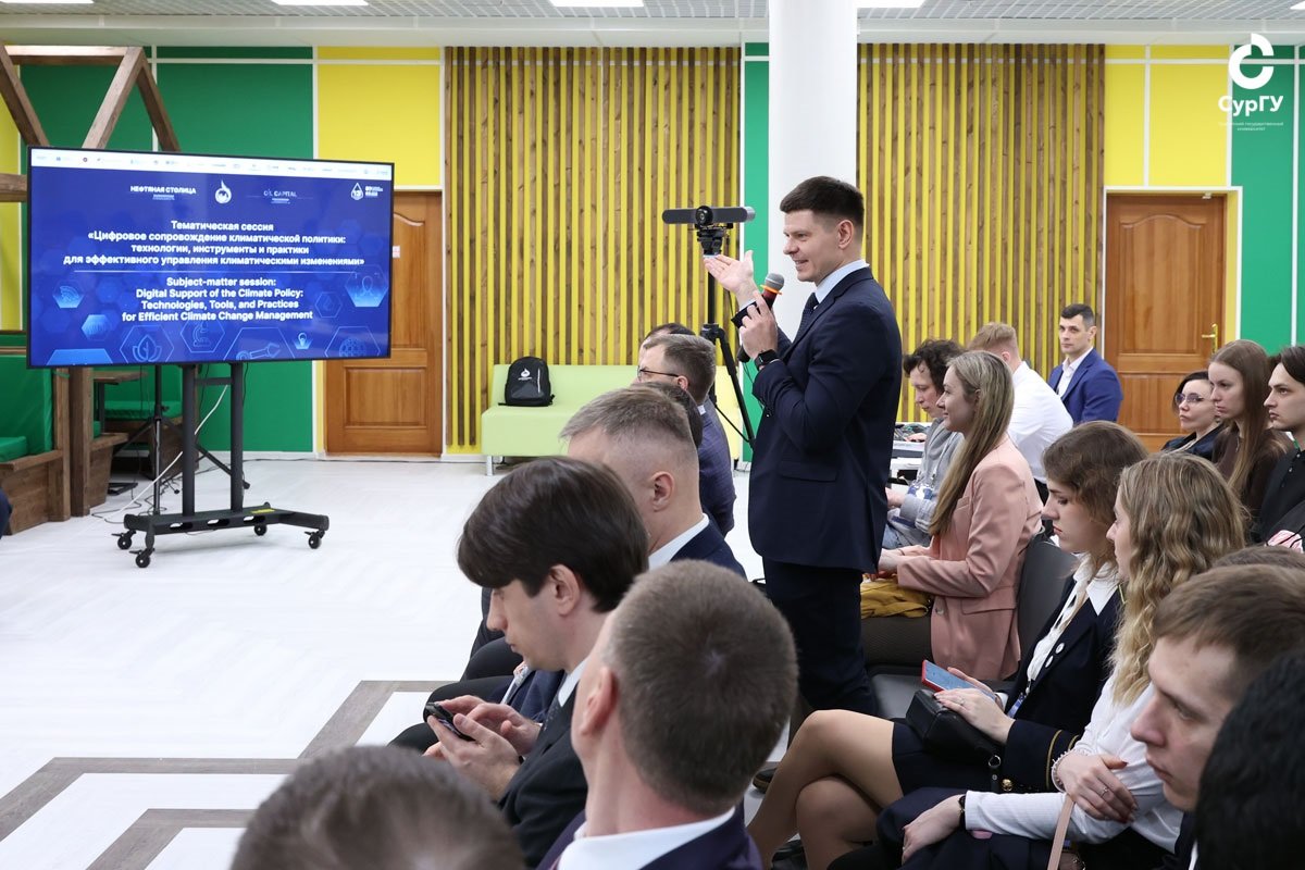 На полях VIII Международного молодежного научно-практического форума «Нефтяная столица» 19 марта 2025 прошла тематическая сессия «Цифровое сопровождение климатической политики: технологии, инструменты и практики для эффективного управления климатическими изменениями».