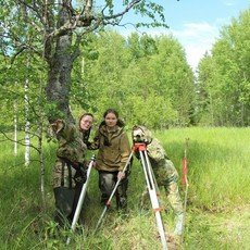 Лаборант Центра коллективного пользования Гаевская Виктория Викторовна совместно с научными сотрудниками и студентами ИГОиС (каф. истории России) осуществляет зондаж болот для определения подболотного рельефа, разбивку территории с использованием тахеометра и отбор образцов посредством геологического бурения.